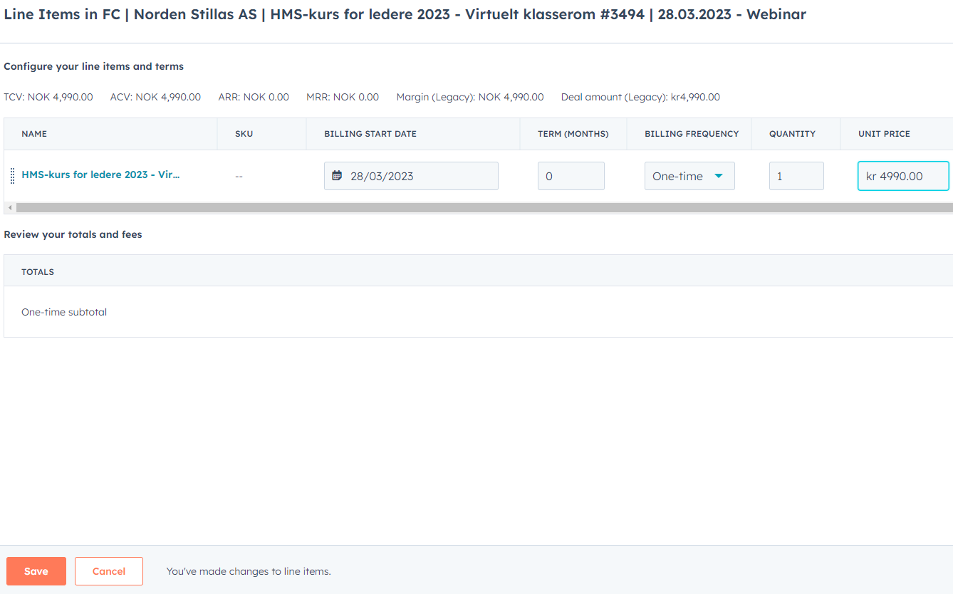 Hvis kurset skal inkluderes, må vi i Hubspot legge til pris på line item prisen til BHT pris (på denne måten får vi oversikt over hvor mye vi inkluderer i pakker).