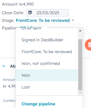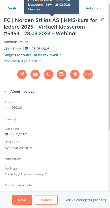 Alle kursbestillinger via hjemmesiden går via API mellom Frontcore og Hubspot, der de havner i pipeline NOcourse på deals. Alle bestillinger ligger i fanen Frontcore: To be reviewed.