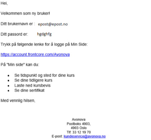 Ved bestilling av kurs får alle deltakere en epost med tilgang til «Min Kursside»