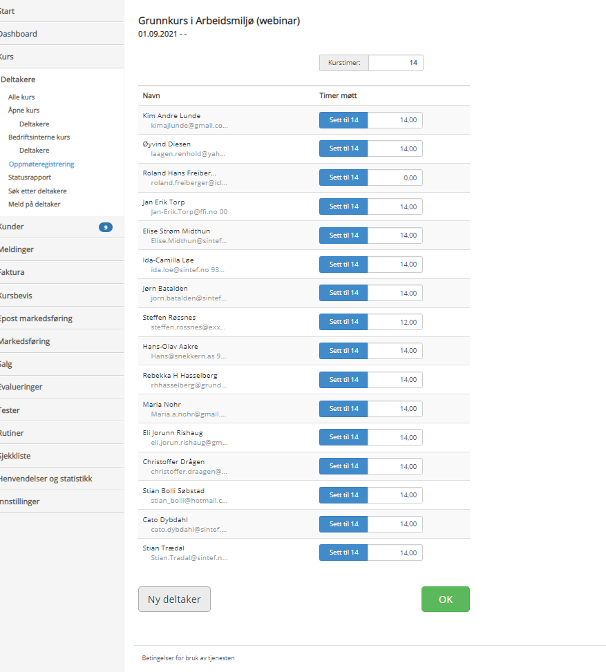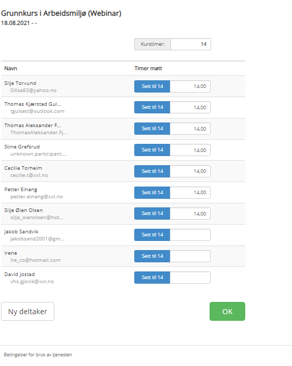 4. Fyll så inn tiden deltakeren har deltatt og trykk ok